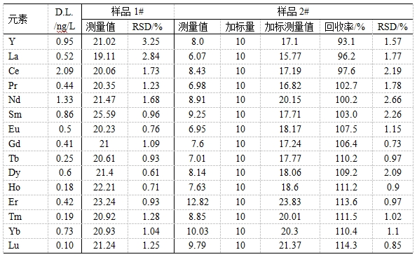 油田稀土示蹤劑主要用來考察油田井間的導(dǎo)通性,具有無放射性、安全穩(wěn)定、用量少、分析精度高等特點。將所得油田水樣搖勻過濾,稀硝酸稀釋一定倍數(shù),以內(nèi)標法校正樣品基體對待測同位素影響,考察Y、La、Ce等15種稀土示蹤劑的檢出限、精密度(以RSD表示)、加標回收率。發(fā)現(xiàn)檢出限為0.10~2.09ng/L;樣品1#的精密度為0.61%~3.25%;樣品2#中各元素加標回收率為93.1%~114.3%,精密度為0.85%~2.66%。