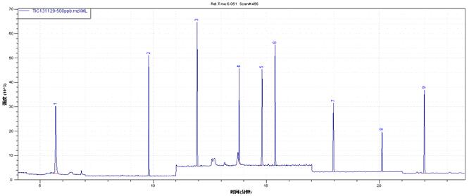 水樣經(jīng)固相萃取柱濃縮、凈化、洗脫后,氮吹定容到一定體積,過濾后樣品經(jīng)氣相色譜分離后,用質(zhì)譜進(jìn)行檢測。通過與待測目標(biāo)物標(biāo)準(zhǔn)質(zhì)譜圖相比較和保留時間進(jìn)行定性,外標(biāo)法定量。