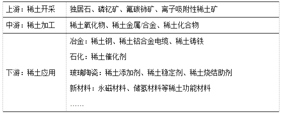稀土產業(yè)鏈主要由稀土資源開采,稀土材料制備,以及稀土應用領域構成。其中:稀土資源開采主要涉及的稀土礦物有氟碳鈰礦、獨居石、磷釔礦,以及離子吸附性稀土礦;稀土材料制備包括精礦分解以及冶煉;稀土應用領域包括冶金、軍事、石化、玻璃陶瓷、農業(yè)、新材料等領域,是我國關鍵的戰(zhàn)略性資源。