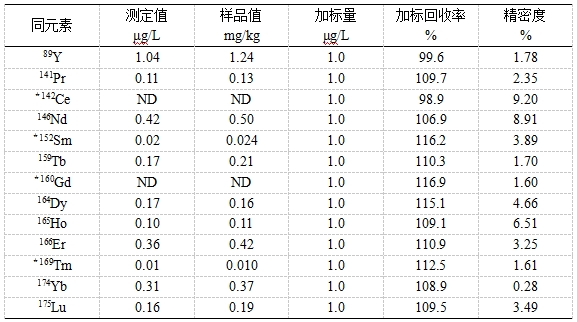 參考《GB/T 18115.1-2020 稀土金屬及其氧化物中稀土雜質化學分析方法 第1部分:鑭中鈰、鐠、釹、釤、銪、釓、鋱、鏑、鈥、餌、銩、鐿、镥和釔量的測定》,將高純氧化鑭用稀硝酸溶解,利用內標法進行校正??疾旒訕嘶厥章始熬芏取7椒訕嘶厥章蕿?8.9%~116.9%,精密度為0.28%~9.20%。