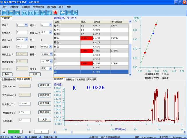 樣品測(cè)試:于原子吸收光譜儀波長(zhǎng)766.5nm處,使用空氣-乙炔火焰,以水調(diào)零,測(cè)量試液的吸光度,減去隨同試料的空白試驗(yàn)溶液的吸光度,從工作曲線上查出相應(yīng)的鉀濃度。