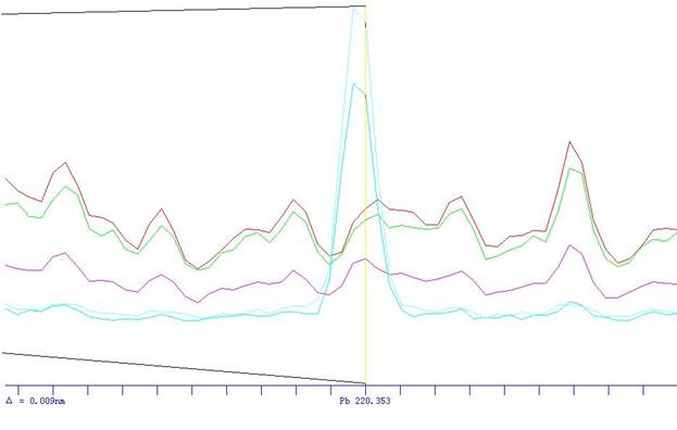 根據(jù)ICP軟件譜線庫(kù)提供所有元素不同譜線,首先選擇被測(cè)元素靈敏度高 的譜線,其次考慮不受樣品基體及被測(cè)元素相互之間干擾小的譜線的原則,選擇分析線如下。