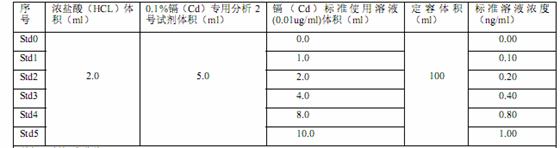 使用鎘(Cd)標(biāo)準(zhǔn)使用溶液(0.01ug/ml),優(yōu)級(jí)純鹽酸(HCL) ,0.1%鎘(Cd)專(zhuān)用分析 2 號(hào)試劑,去離子水(電阻率≥10M歐姆)等試劑。