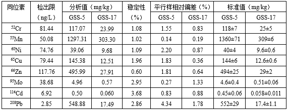 在優(yōu)化的儀器工作參數(shù)下,建立標(biāo)準(zhǔn)溶液工作曲線(線性相關(guān)系數(shù)達(dá)0.999以上),再分別取待測溶液上清液上機(jī)測試。其中:取兩個(gè)平行樣測試結(jié)果的平均值為分析值;對(duì)樣品空白溶液平行測定11次,計(jì)算11次測試結(jié)果的SD,以3×SD/k(k為標(biāo)準(zhǔn)溶液工作曲線的斜率)對(duì)應(yīng)的值為方法檢出限。取一份GSS-17樣品溶液進(jìn)行穩(wěn)定性考查,即間隔2min采集一個(gè)數(shù)據(jù),連續(xù)采集7組數(shù)據(jù),計(jì)算7組數(shù)據(jù)的RSD,作為穩(wěn)定性指標(biāo)。所得實(shí)驗(yàn)數(shù)據(jù)見表4。