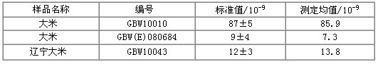 選用三種國(guó)家標(biāo)準(zhǔn)大米樣品進(jìn)行樣品消解及樣品測(cè)試,測(cè)試結(jié)果如表1所示: