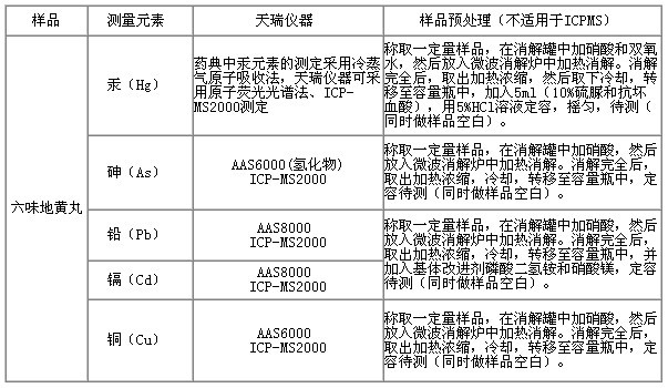 天瑞儀器參考《中華人民共和國藥典》,采用原子吸收光譜儀(AAS6000;AAS8000)、原子熒光光譜儀(AFS200系列)、電感耦合等離子體質(zhì)譜儀(ICP-MS2000),對六味地黃丸中鎘、鉛、銅、砷、砷、汞等重金屬的測定進行研究,測試結(jié)果準確度高,重復(fù)性好。