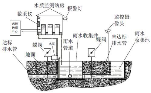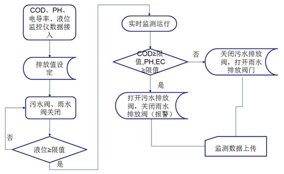 監(jiān)測系統(tǒng)控制采樣單元將水樣導(dǎo)入監(jiān)測室,并啟動(dòng)監(jiān)測水質(zhì)的COD、pH、電導(dǎo)率等常規(guī)參數(shù)。達(dá)標(biāo)雨水通過電控閥門排入市政雨水管網(wǎng),一旦超標(biāo)電控閥門關(guān)閉,禁止雨水排入市政雨水管網(wǎng),并通過水泵將超標(biāo)雨水泵入企業(yè)污水處理系統(tǒng)處理,達(dá)標(biāo)后排放至市政污水管網(wǎng)。同時(shí)所有監(jiān)測數(shù)據(jù)經(jīng)由數(shù)據(jù)采集單元將數(shù)據(jù)統(tǒng)計(jì)后,由傳輸設(shè)備傳輸至企業(yè)監(jiān)測中心或環(huán)保局,由此完成對(duì)雨水排放自動(dòng)、實(shí)時(shí)、連續(xù)監(jiān)控。