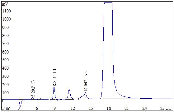 準確稱取0.2g(精確至0.0001g)試樣,采用氧彈燃燒后冷卻定容,經(jīng)0.22μm的水系濾膜過濾后上機得到測試譜圖如下圖2、圖3所示。