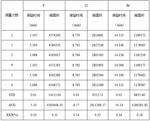 取2.0μg/mL F-、Cl-、Br-混合標準標準溶液重復進樣6次,考察保留時間和峰面積的重復性,詳見圖4;其中保留時間(tR)相對偏差在0.10%-0.16%之間,峰面積(S)的相對標準偏差在0.38%~0.53%之間,重復性結(jié)果詳見表1。