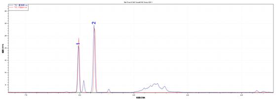 目標物在0.5ppm-10ppm線性良好。取空白塑膠樣品加標,樣品經(jīng)過正己烷超聲萃取。10ppm加標水平(圖5),得到比較滿意的效果。