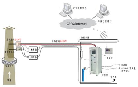 采樣探頭安裝于企業(yè)廢氣排口,排口被測廢氣被負壓抽泵抽取進入采樣探頭探桿(不加熱),經(jīng)過陶瓷濾芯進入伴熱管線(伴熱溫度可設(shè)置),樣氣在伴熱管中繼續(xù)傳輸至預(yù)處理系統(tǒng),在預(yù)處理系統(tǒng)經(jīng)過二級過濾和分流后按照一定流量送至在線氣相色譜儀(GC-FID)。在線氣相色譜儀控制內(nèi)置自動取樣平面十通閥和定量環(huán)系統(tǒng)取1mL的被測樣氣,借助載氣送入色譜柱分離和FID做定性、定量分析。分析結(jié)果通過工控機保存,并和排氣筒監(jiān)測排放參數(shù)一起通過數(shù)采儀送至環(huán)保監(jiān)控平臺。
