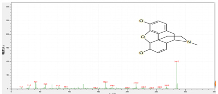 利用罌粟殼生物堿的理化性質(zhì),樣品在強(qiáng)酸環(huán)境下(pH:1-2),采用氣相色譜質(zhì)譜聯(lián)用儀進(jìn)行檢測(cè)。采用保留時(shí)間和標(biāo)準(zhǔn)質(zhì)譜圖特征離子進(jìn)行定性,外標(biāo)法定量。